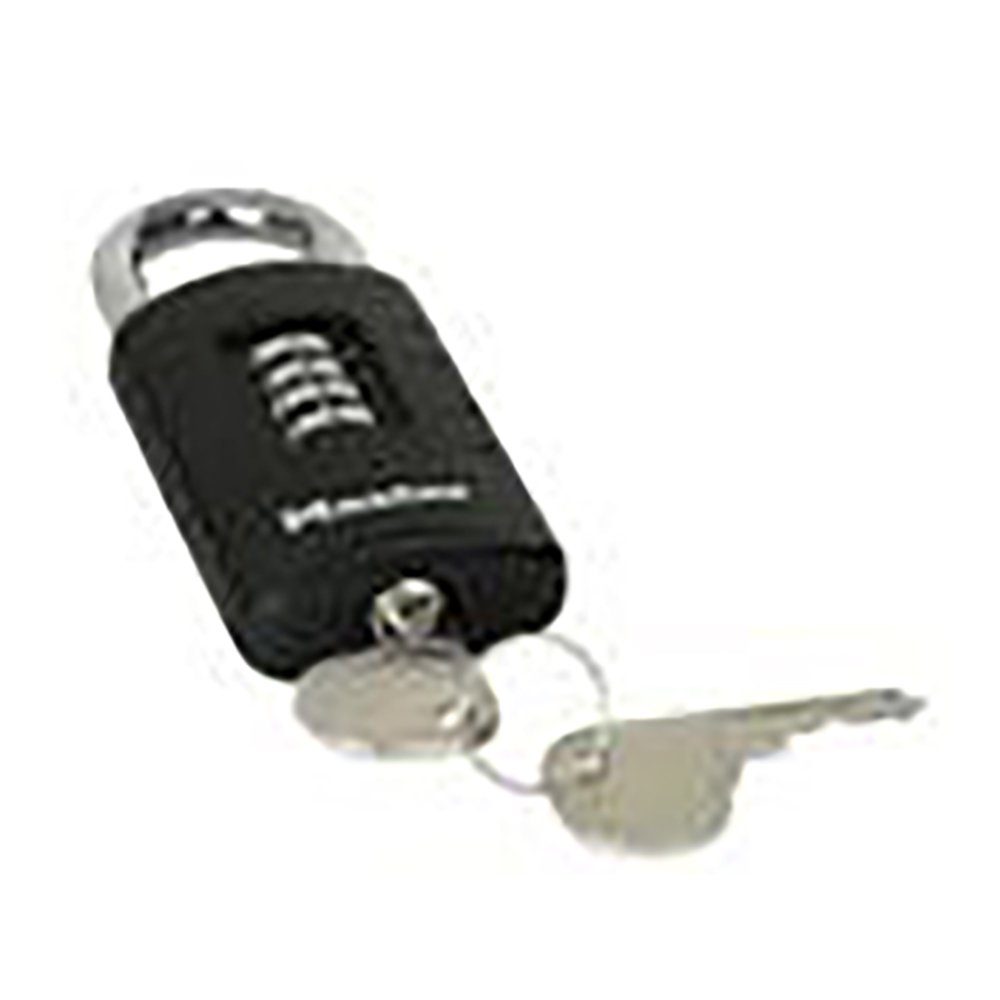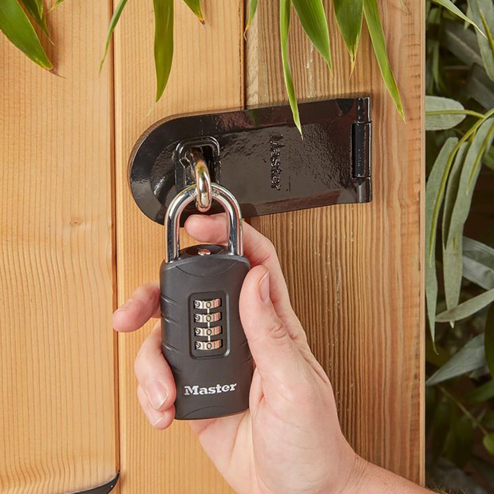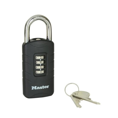 The Master Lock No. 656EURDBLK Set-Your-Own Combination Padlock with override key features a 48mm wide covered zinc body for strength, reliability and weather resistance.